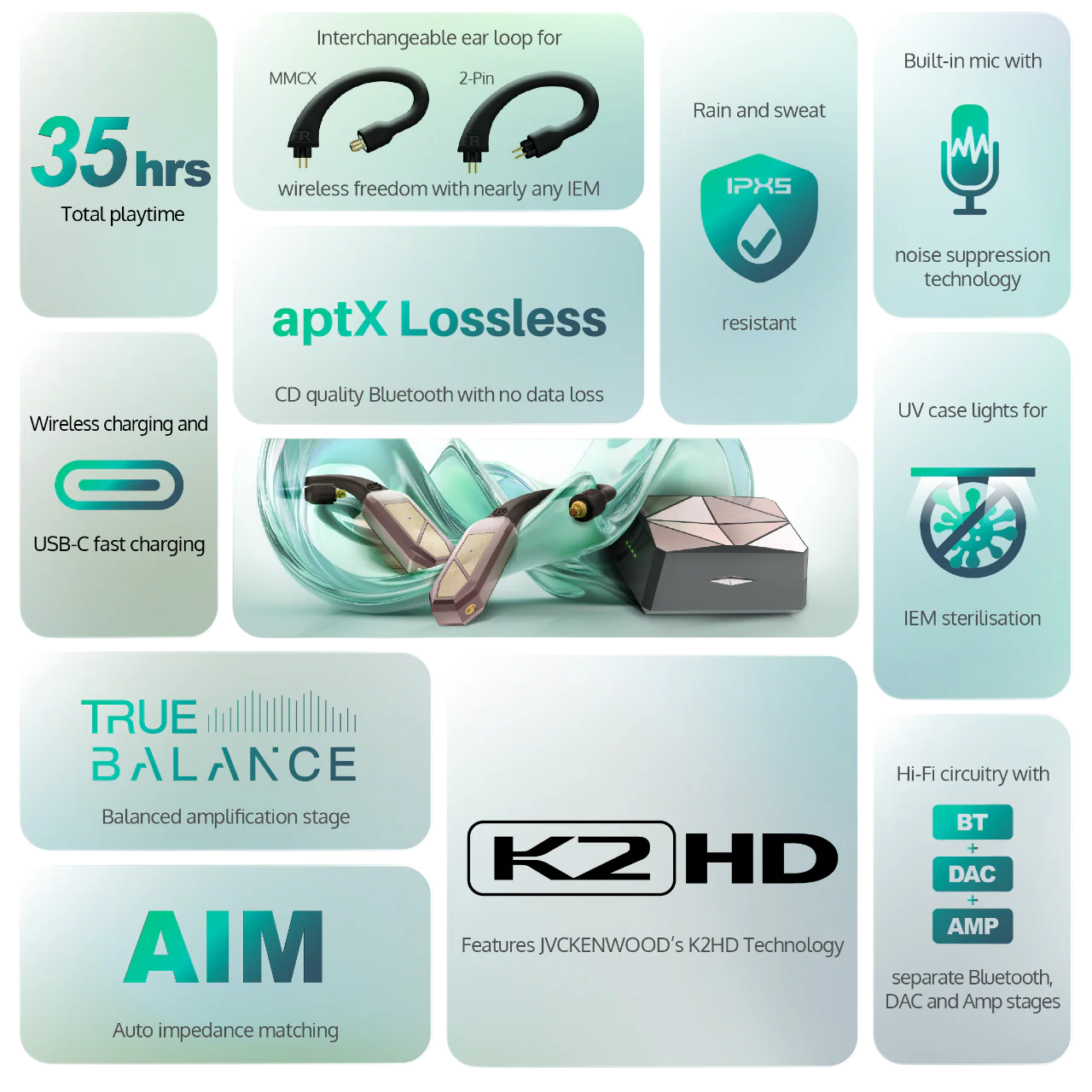 Her bir ünite, aptX Lossless kodeği kullanıldığında sıfır veri kaybıyla tamamen kablosuz olarak CD kalitesinde ses alabilen amiral gemisi QCC5181 yonga setine sahiptir . Bu, dinleyici için kablosuz olmasına rağmen ses kalitesinden ödün vermemek anlamına gelir. aptX Lossless, standart Bluetooth'un dört katına kadar bant genişliği sunarak olağanüstü netlik, mükemmel ses kalitesi ve gerçekten sürükleyici bir dinleme deneyimi sağlar.