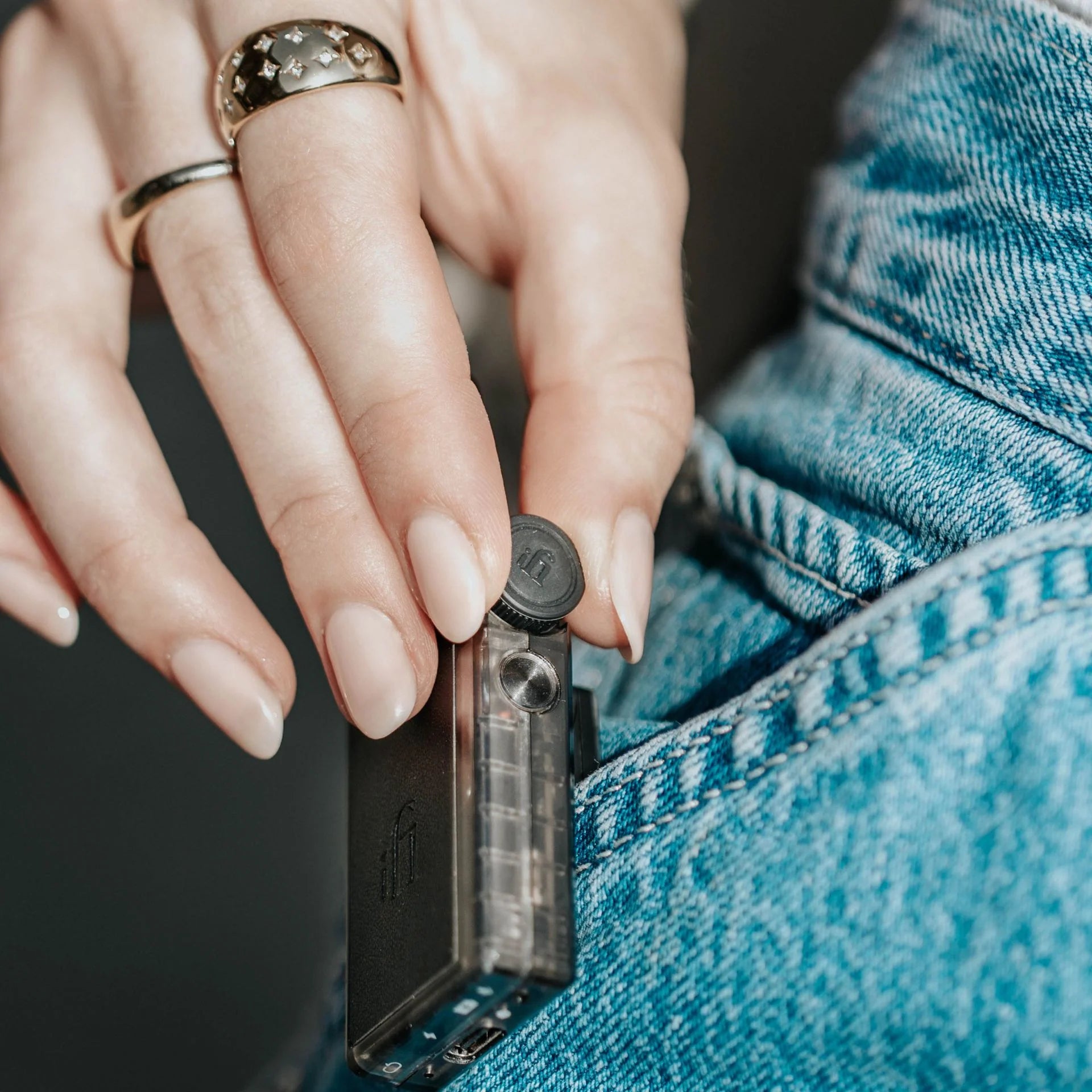 Çıkarılabilir manyetik klips, gövdeye kusursuz bir şekilde entegre edilmiştir; bu sayede GO blu Air'i kemerinize, çantanıza veya ceketinize güvenli bir şekilde takabilirsiniz, ayrıca bir kılıfa gerek yoktur.