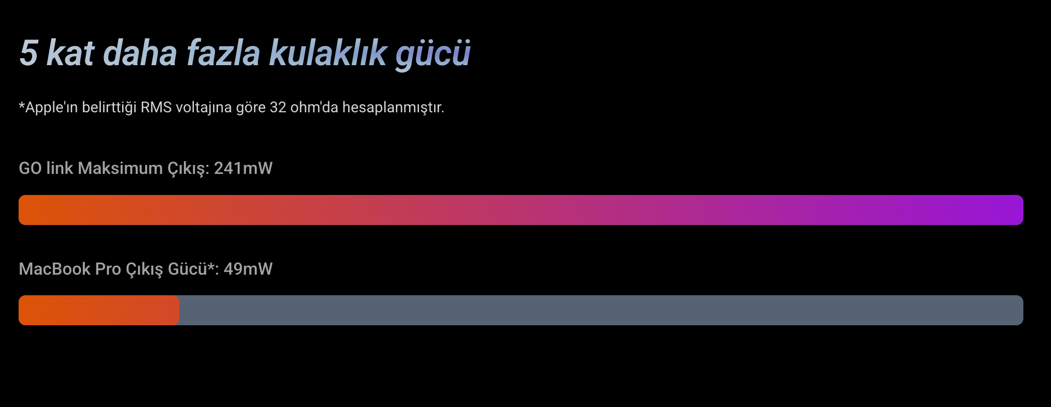 Akıllı telefonlar gibi modern taşınabilir cihazlar, çoğu zaman kulaklık performansından ödün verir; birçoğunda kulaklık girişi bulunmaz veya adaptörler aracılığıyla sınırlı çıkış sunar. GO link Max, MacBook Pro'nun kulaklık girişinin beş katı olan 241 mW'a kadar çıkış gücüyle bu sorunu çözüyor.