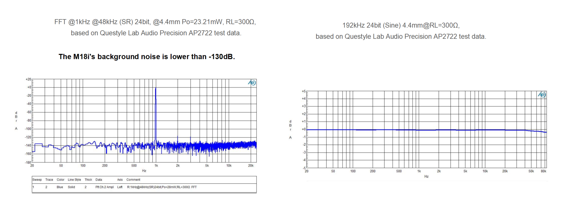 Tıpkı saf siyah bir arka planın renklerin zenginliğini vurgulaması gibi, yalnızca düşük bir gürültü tabanı (noise floor) sesteki detayları açığa çıkararak gerçek Hi-Fi oluşturabilir. M18i'nin yüksek çözünürlüğü, Questyle Laboratuvarı test ortamında gösterildiği üzere -130dB'lik ultra düşük bir gürültü tabanı üretir.
